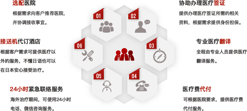 向客户提供医疗机构和治疗信息、协助取得医疗签证、安排接送机、代订酒店、派遣医疗翻译、医疗费代付等在海外接受治疗等所需的一站式服务。回国后可根据客户需求安排定期复查。